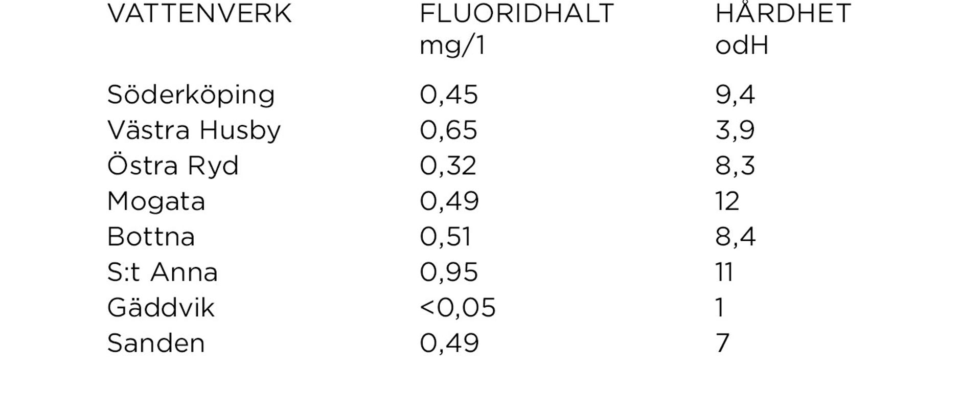 Söderköping: Flourid 0,40mg/l, hårdhet 9°dH
