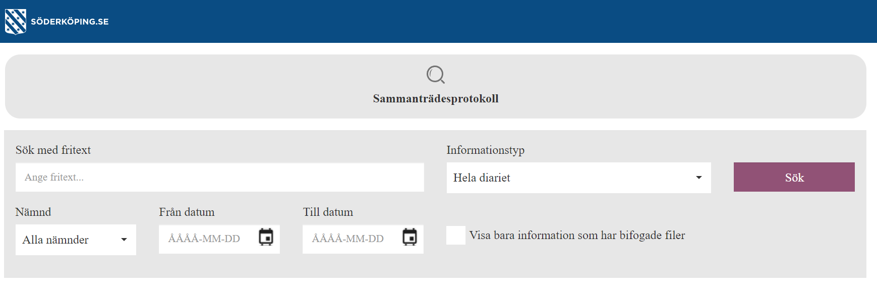 I Söderköpings kommuns e-diarium hittar du våra nämnders och förvaltningars skrivelser, kallelser till nämndernas sammanträden, protokoll samt kontaktuppgifter till förtroendevalda. E-diariet är sökbart för sammanträden, ärenden och handlingar som registrerats från och med den 1 januari 2022.