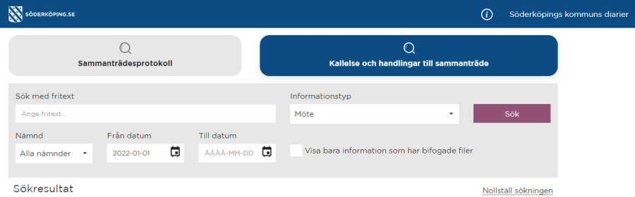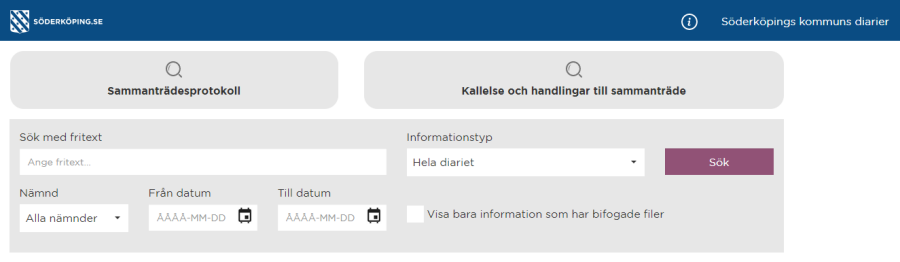 I Söderköpings kommuns e-diarium hittar du våra nämnders och förvaltningars skrivelser, kallelser till nämndernas sammanträden, protokoll samt kontaktuppgifter till förtroendevalda. E-diariet är sökbart för sammanträden, ärenden och handlingar som registrerats från och med den 1 januari 2022.