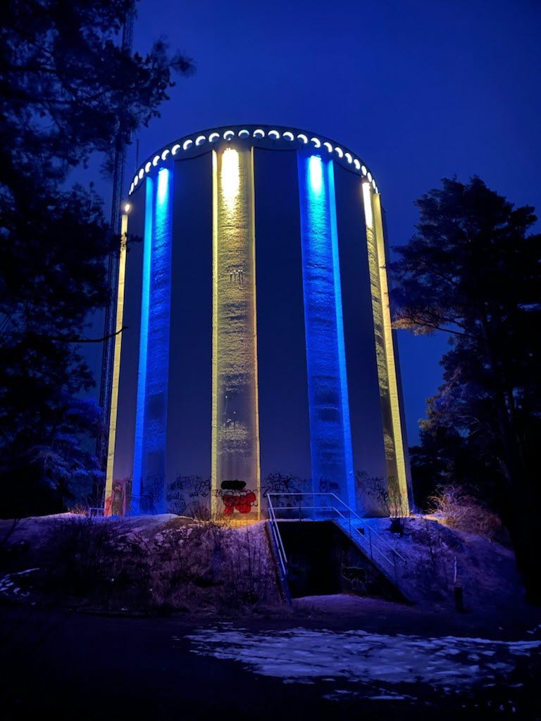 Vi vill visa vår solidaritet och stöd för det ukrainska folket och stå upp för demokratiska rättigheter genom att belysa vårt vattentorn med gult och blått, färgerna i den ukrainska flaggan.