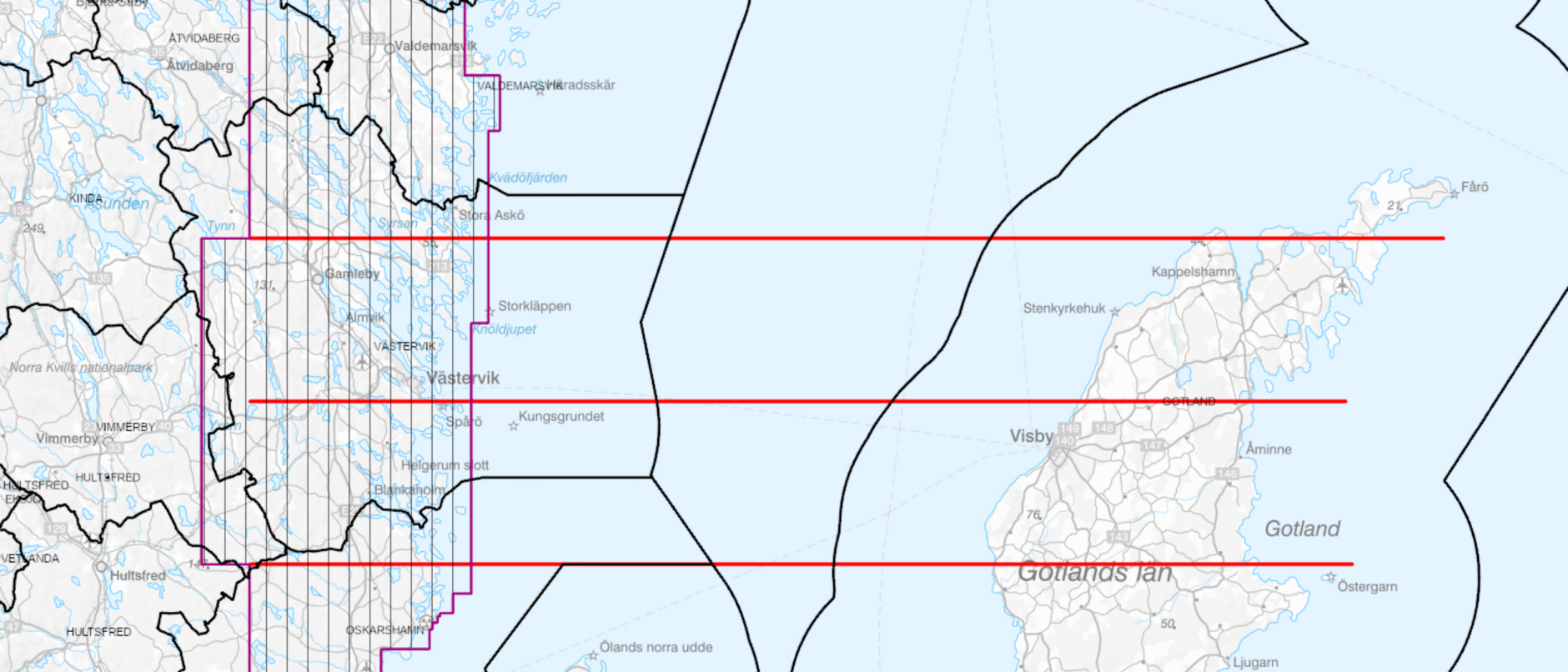 Flygningarna görs på 60 meters höjd med 200 meters linjeavstånd. Det kommer också att flygas fyra stycken mätlinjer till Gotland, markerat med rött på kartan. Syftet är att kartlägga berggrunden.