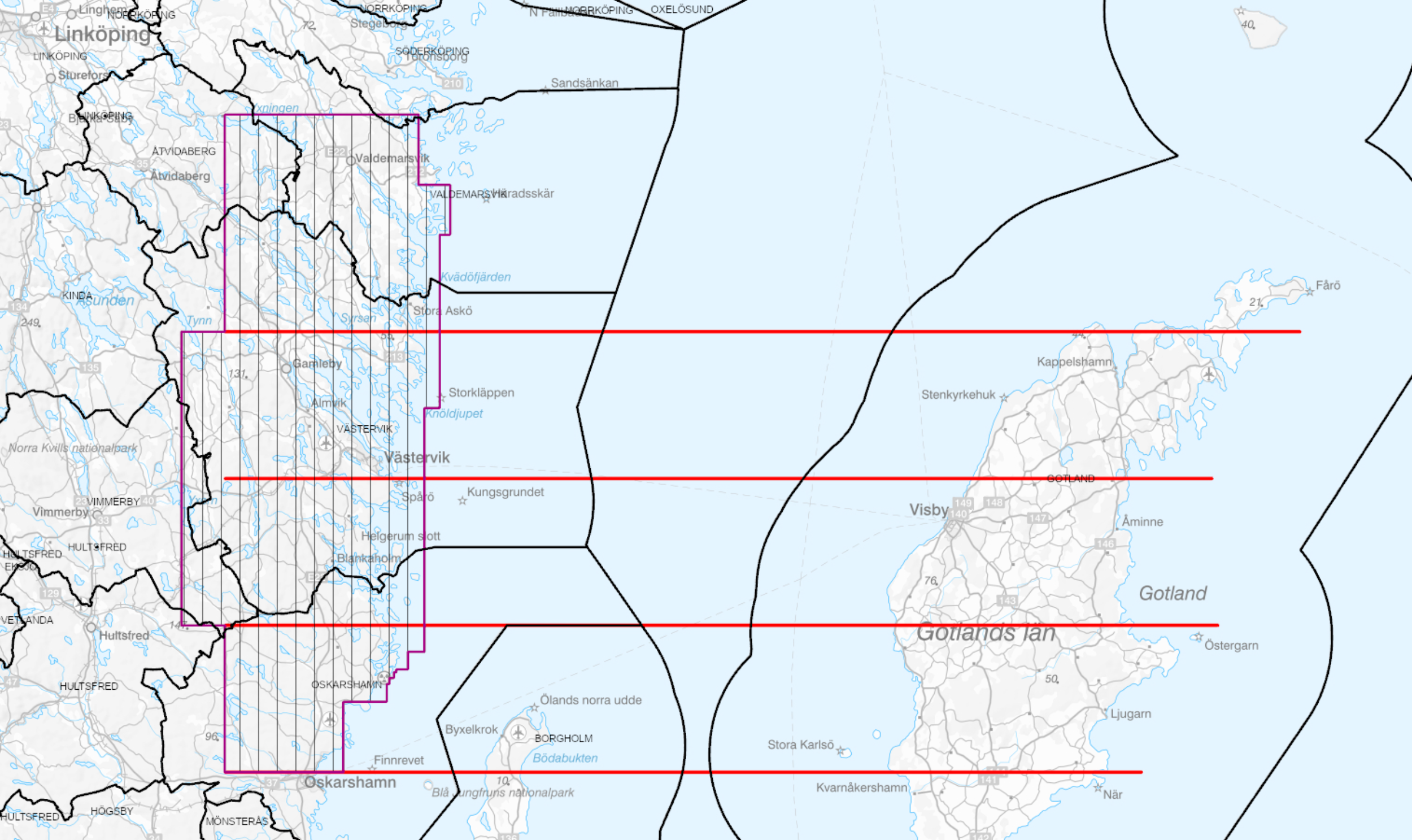 Flygningarna görs på 60 meters höjd med 200 meters linjeavstånd. Det kommer också att flygas fyra stycken mätlinjer till Gotland, markerat med rött på kartan. Syftet är att kartlägga berggrunden.