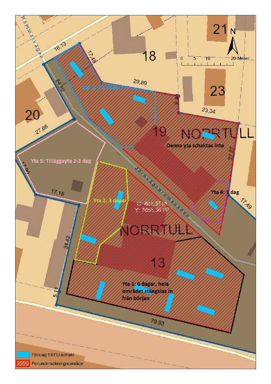 På kartan ser du vilka områden som berörs i detalj och uppskattad tidsplan för varje etapp. Det är gräsområdet vid brandstationen, tillhörande parkeringar och infart samt området snett bakom brandstationsbyggnaden. Även marken vid förskolorna bakom byggnaden kommer beröras av utgrävningen.