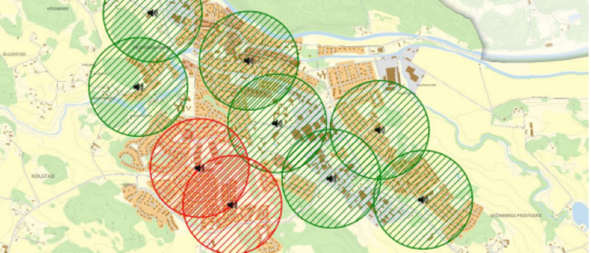 Förklaring bild: Cirklarna visar ungefärlig räckvidd för varje sändare. Gröna cirklar visar aktiva sändare och de röda cirklarna visar de två sändare som nu är aktiva igen.