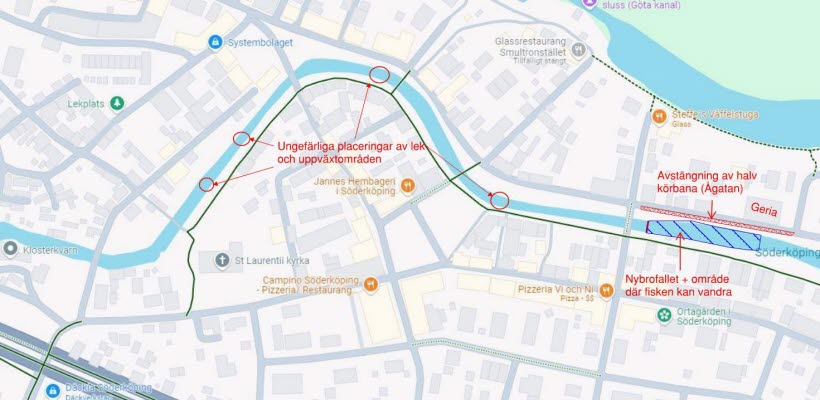 Detta innebär att vi på vissa utvalda ställen, mellan Nybrofallet och klosterkvarnen, kommer att tillskapa lek- och uppväxtplatser för fisken.