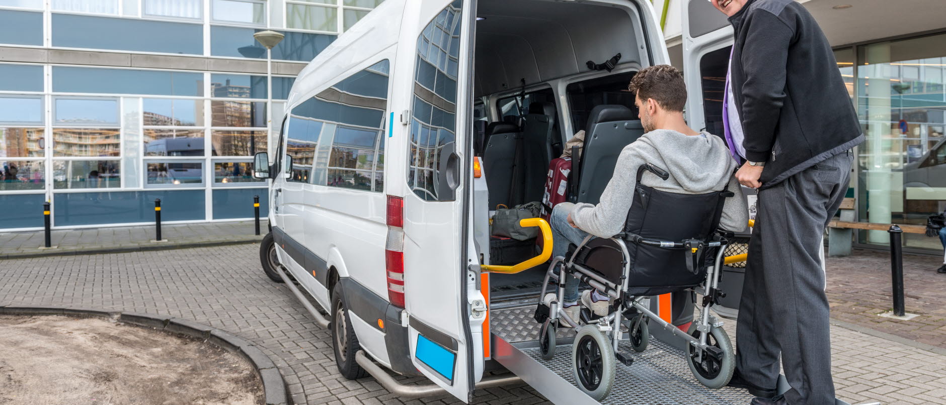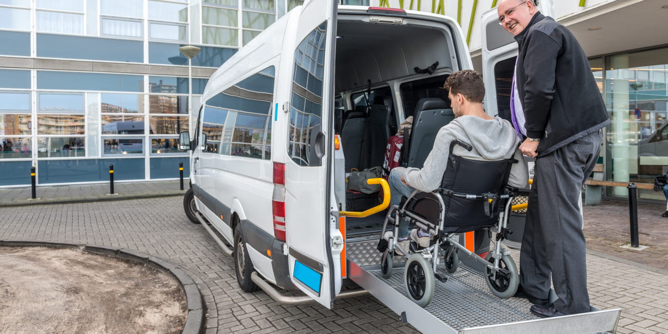 En person i rullstol som får hjälp in i en färdtjänstbil