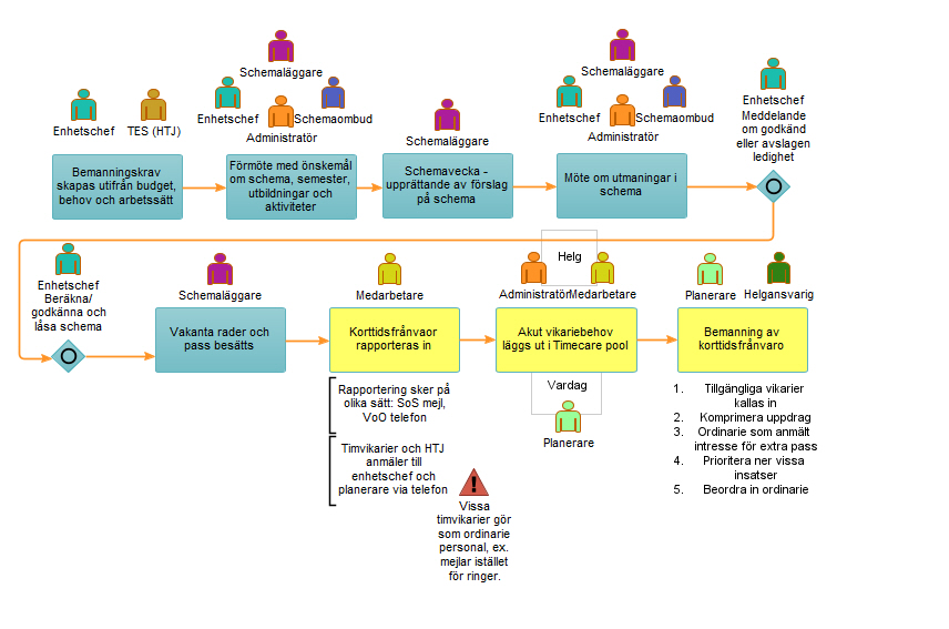 Bemanningshandbokens syfte är att utifrån brukarperspektiv, patientsäkerhet, kvalitét, arbetsmiljö och ekonomi säkerställa en god bemanning och schemaläggningsprocess inom Vård och omsorg samt Stöd och service. Syftet är också att tydliggöra ansvarsfördelningen inom vår organisation.Det övergripande målet är att ha en god bemanning för att fullgöra åtaganden inom Vård och omsorg samt Stöd och service utifrån: