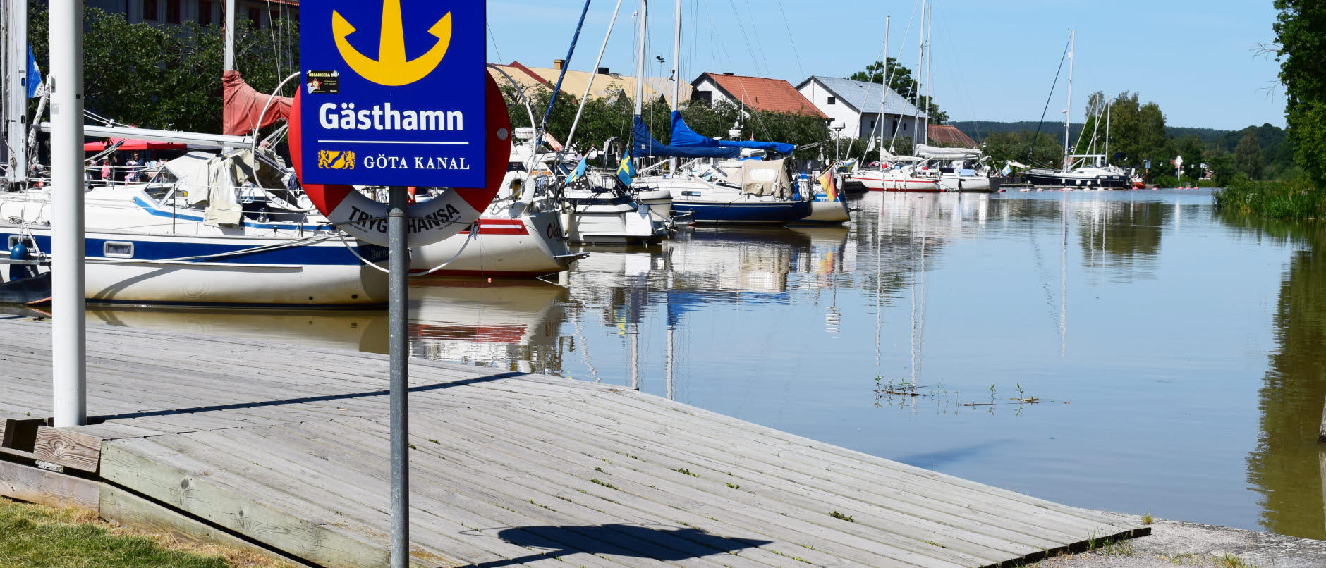 Bild visar en *Gästhamnsskylt framför en brygga med båtar i Göta kanalhamnen i Söderköping.
